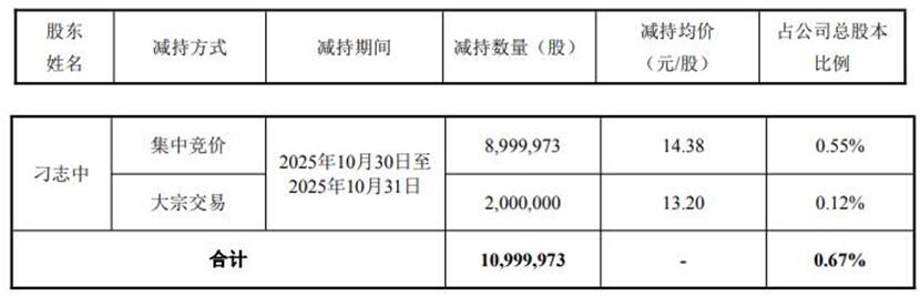 根据公告,截止到 2025年 10月 31日为止,在公司股票上市交易的期间内,刁志中通过集中竞价交易方式累计出售公司股份89,999,730股;大宗交易方式累计卖出公司股份20,000,000股。总共有109,999,730股被其减持。上述行为的成交均价分别为 14.38元和 13.20 元,合计成交金额为 156,000,000元。